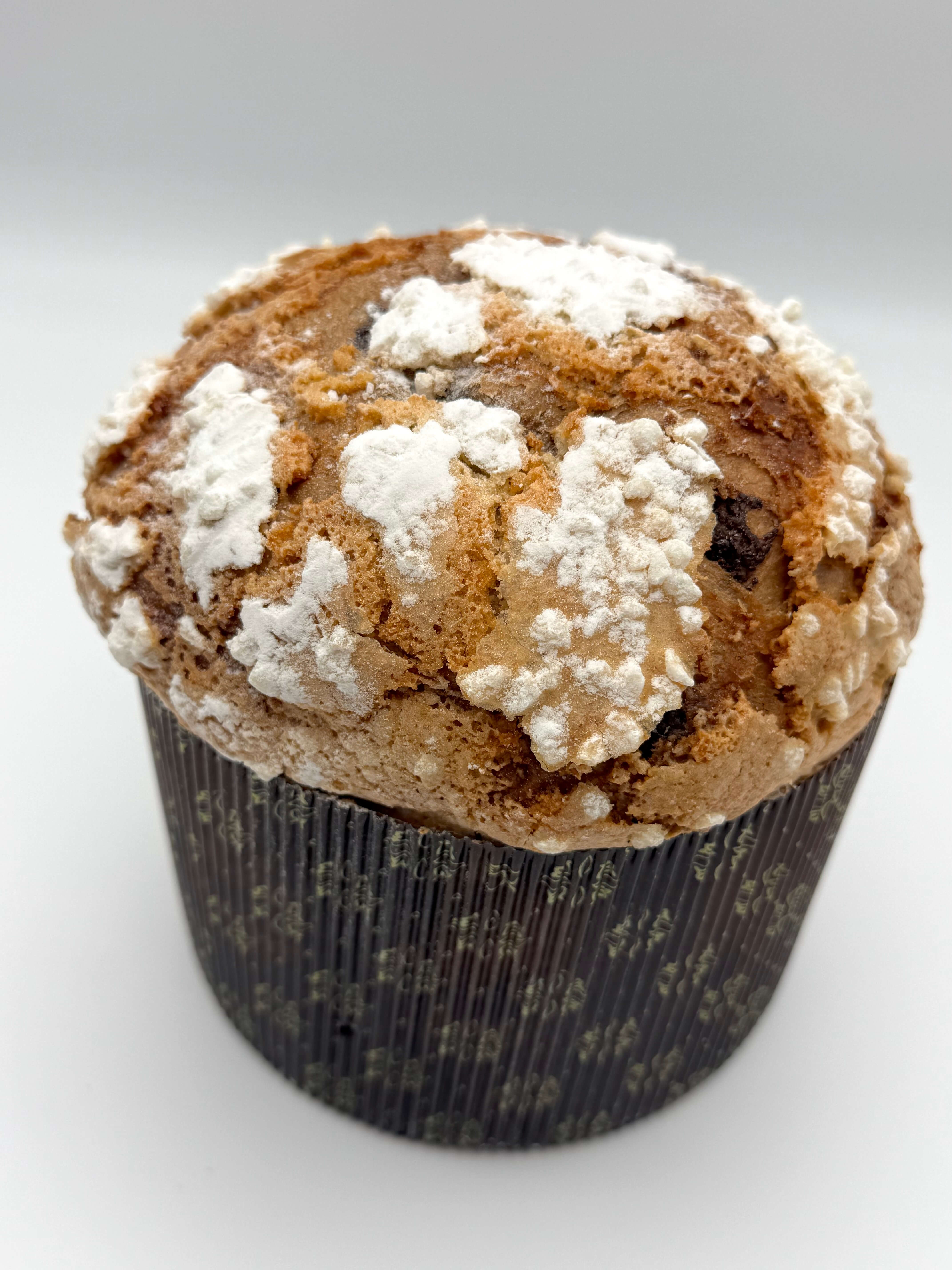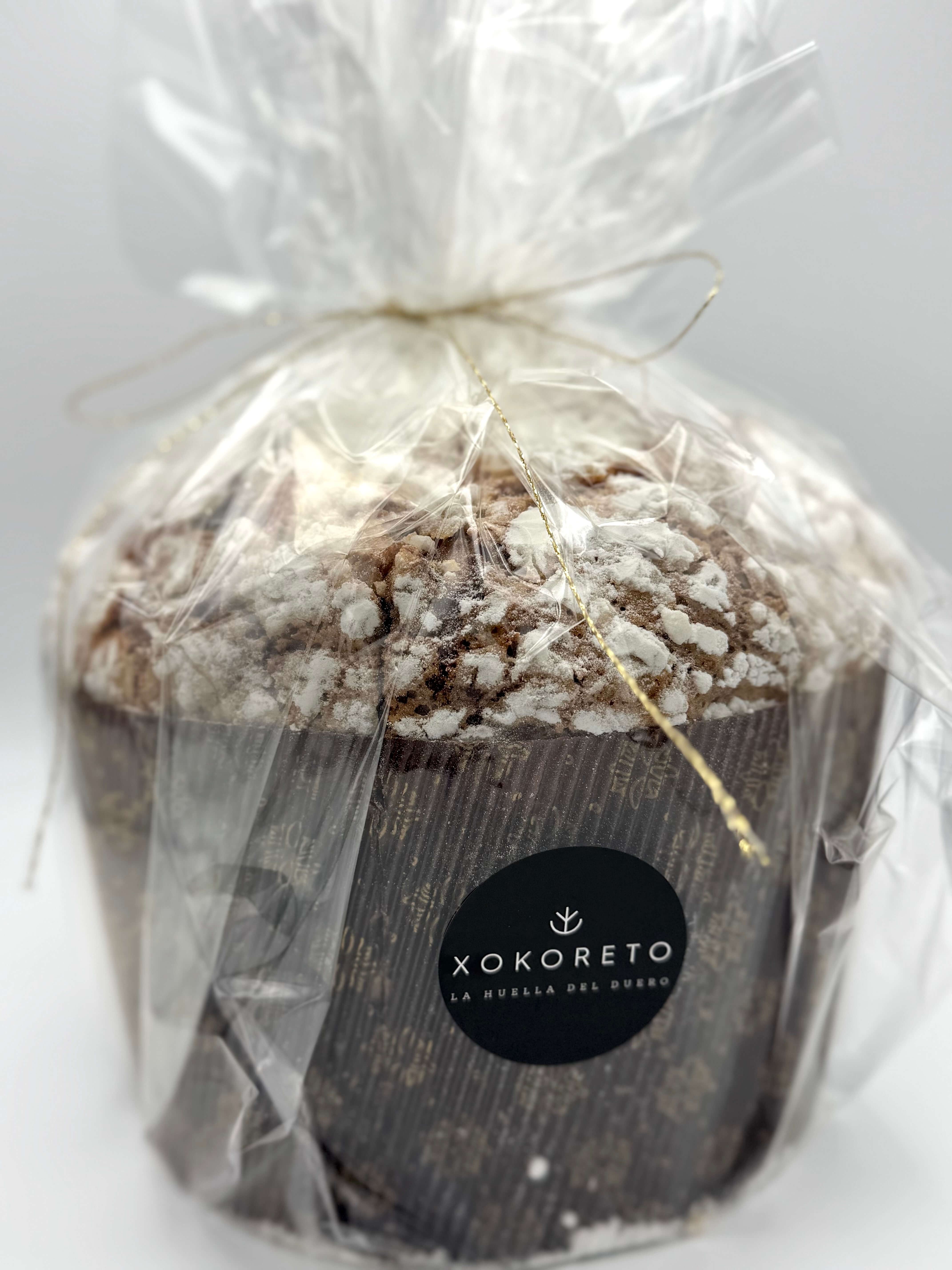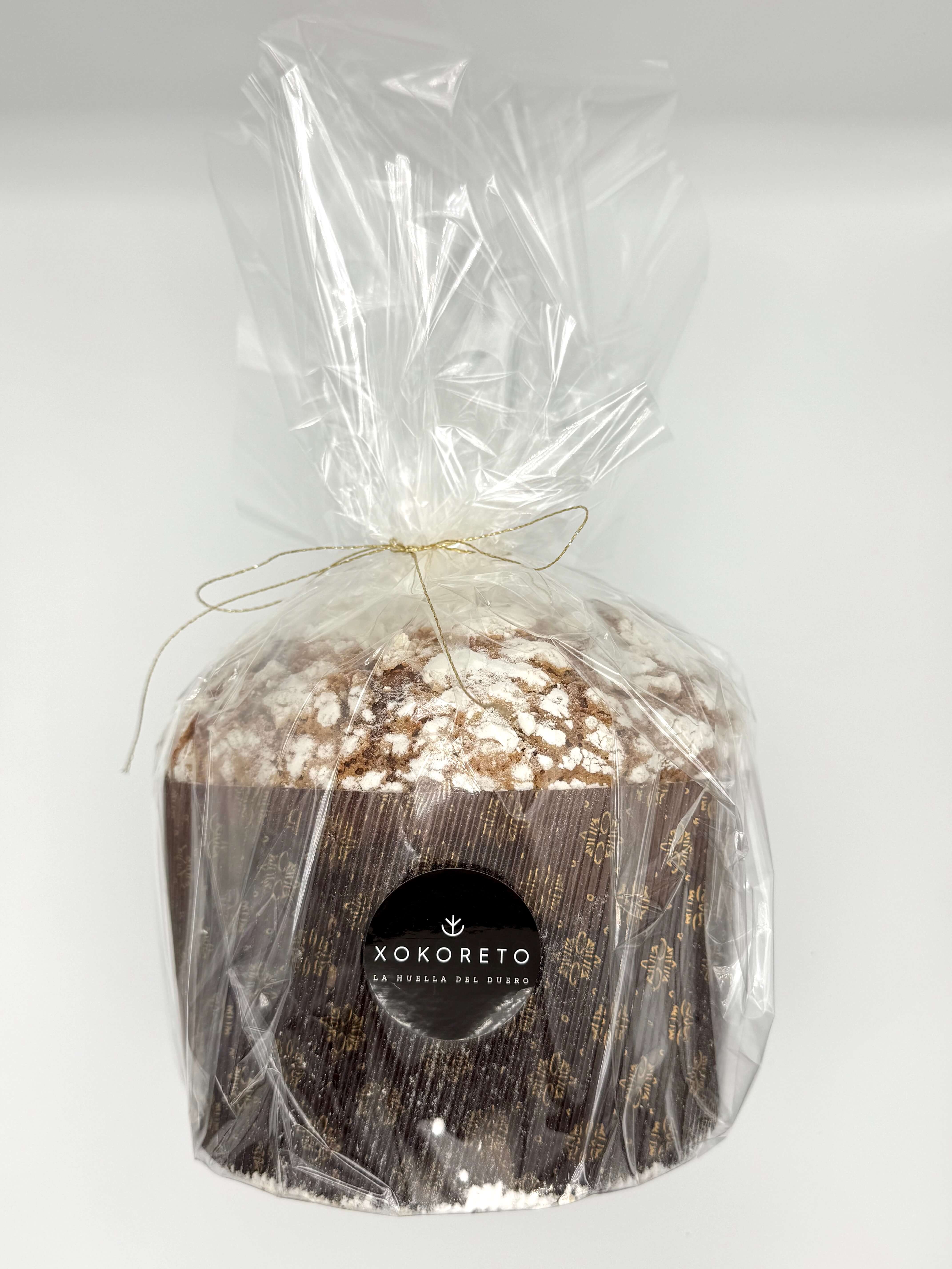 Panettone de masa madre típico de Navidad relleno de trocitos de chocolate y naranja confitada.